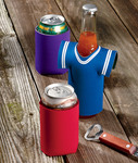 jersey-knit foam • resembles sports jersey • insulates 12-oz. long-neck bottles • Sizes: 4"w x 5"h